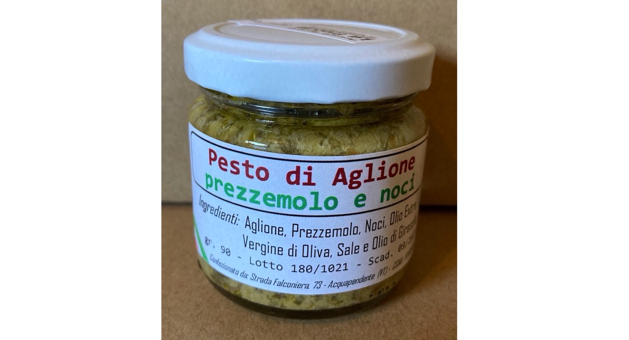 Ingredienti: Aglione, Prezzemolo, Olio Extra Vergine di Oliva, Noci, Sale e Olio di Girasole.